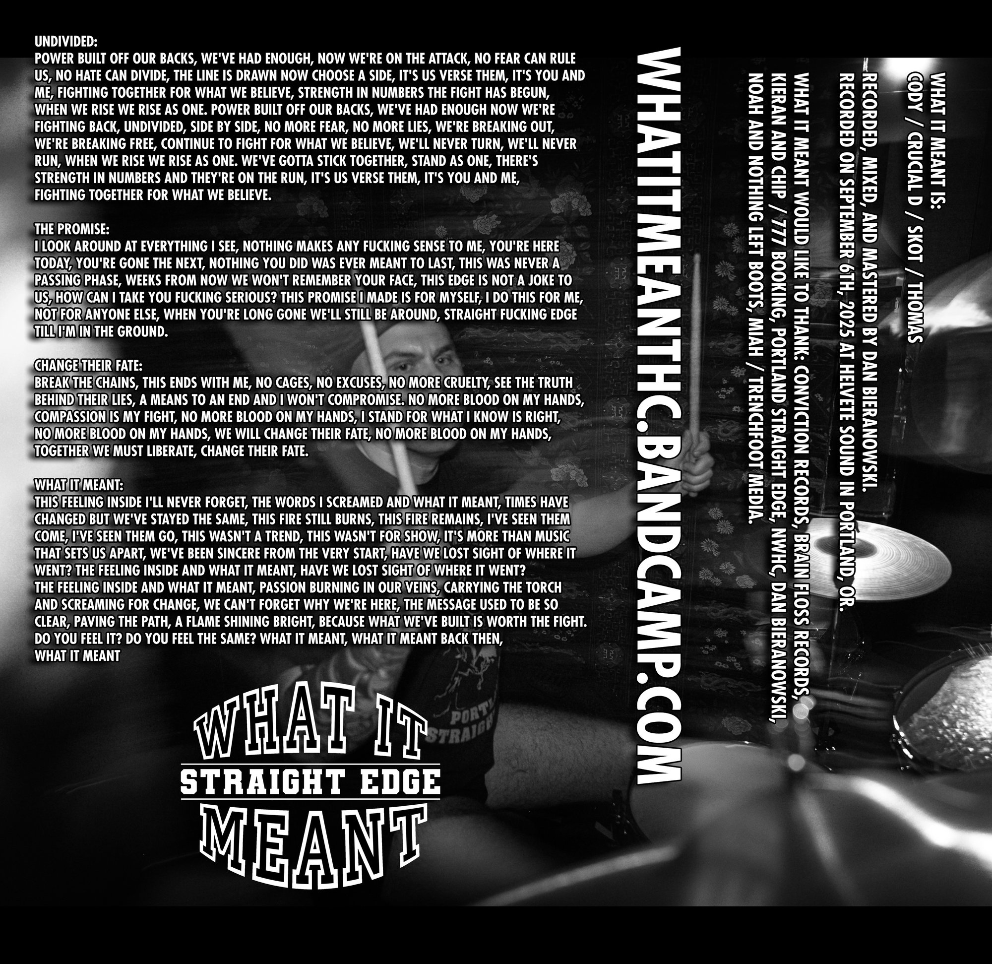 Straight Edge is back? The edge never left; What It Meant are a band comprised of scene veterans (including members of Life Force, Vanguard, and bands released on Commitment Records more than a decade ago) from Portland, USA, revisiting the classic straight edge sound in the vein of Floorpunch, The First Step etc across 4 tracks. Limited run of 30 tapes, with 10 on red shells and 20 on black shells. Unfortunately the price of everything has increased again so these tapes are slightly higher priced than our normal releases. Distros get in touch if you'd like copies!